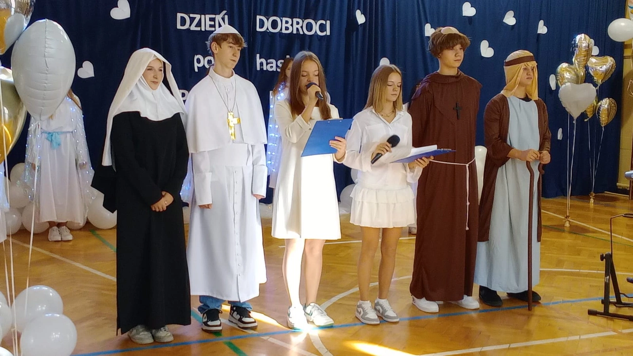 Rok temu dwie nauczycielki - polonistka i katechetka - zaproponowały uczniom Bal Wszystkich Świętych z gościem specjalnym, którym był Krzysztof Drabik, zwycięzca „Mam Talent”. - Bardzo im się spodobało, więc uznałyśmy, że trzeba to w jakiś sposób kontynuować co roku. Ażeby się nie powtarzać, wymyśliłyśmy Dzień Dobroci pod hasłem "Pokój i Dobro" z konkursem na dobry uczynek. Nazwa jest nieprzypadkowa, ponieważ zaplanowałyśmy dzień przed uroczystością Wszystkich Świętych, od których w sposób szczególny możemy uczyć się dobroci i pokoju - wyjaśnia J. Schmidt.