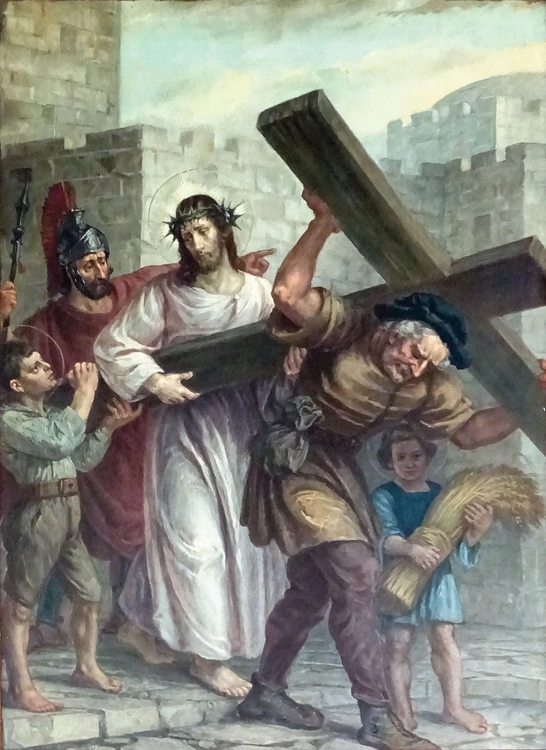 Od średniowiecznych malowideł po współczesne rzeźby artyści ukazywali moment, gdy Cyrenejczyk bierze na ramiona krzyż Chrystusa. Te dzieła często podkreślają fizyczną rzeczywistość niesienia ciężaru. Szymon jest pochylony, przymuszony do dźwigania krzyża, nie patrzy w ogóle na Skazańca, a raczej jest przygnębiony grozą sytuacji, która go całkowicie zaskoczyła. Tak właśnie ową scenę ukazał plastycznie prof. Kaspar Schleibner z Monachium. Jego drogę krzyżową można zobaczyć wokół ambitu na ścianach korytarza prowadzącego do krypty pod prezbiterium Kościoła św. Józefa w Zabrzu. Wyraźnie nieszczęśliwy Szymon ugina się pod ciężarem krzyża. Tuż obok niego jeden z małych chłopców niesie snop zboża, z którym prawdopodobnie nasz bohater wracał z pola, przekonany, że ma już za sobą cały trud dnia. Po pracy w polu był zmęczony, głodny i brudny, a jego jedynym pragnieniem było dostać się jak najprędzej do domu, tymczasem zupełnie niespodziewanie żołnierze siłą go zatrzymali i przymusili, by dźwigał krzyż Jezusa. Zapewne Szymon żałował, że akurat tamtędy przechodził. Najgorszy nie był sam ciężar, ale wystawienie się na pośmiewisko… A jednak ten dzień był najważniejszym w jego życiu. Wpłynął też na jego synów – Aleksandra i Rufusa (Mk 15,21), należących do grona pierwszych chrześcijan, a dziś świętych Kościołów katolickiego, ormiańskiego i prawosławnego.