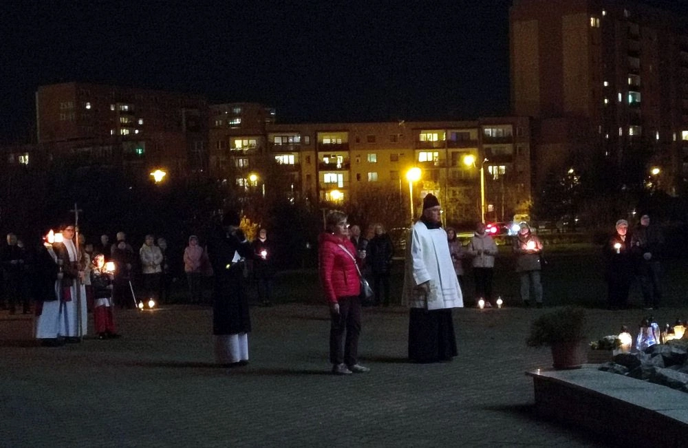 Zabrze. 2.04.2025. W 20. rocznicę śmierci Jana Pawła II odbyła się modlitwa przy Krzyżu Papieskim, przeniesionym z gliwickiego lotniska, gdzie 17 czerwca 1999 roku miało miejsce spotkanie z papieżem.