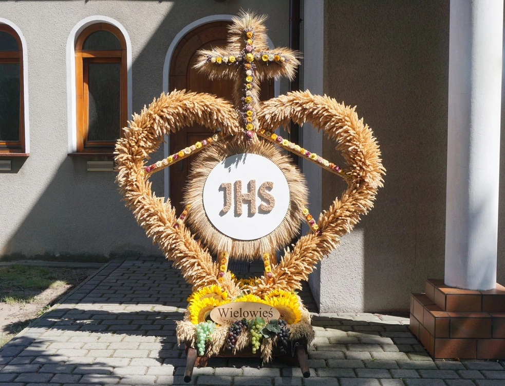 Wielowieś, 24.08.2025. W parafii Wniebowzięcia NMP odbyły się dożynki diecezjalne. Przed rozpoczęciem Eucharystii korony żniwne poświęcił bp Sławomir Oder. Kościół był ustrojony plonami.